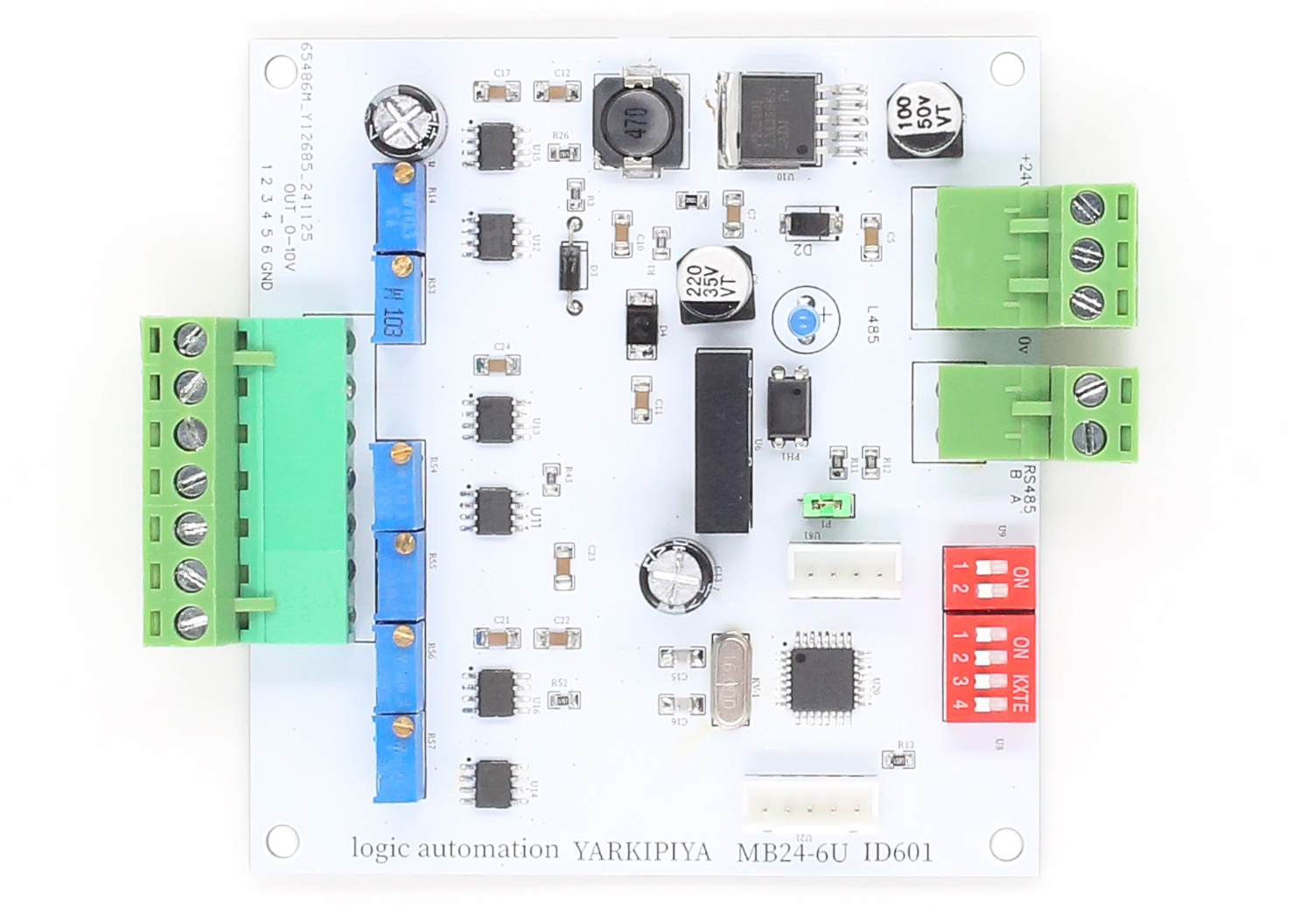 Простейший модуль вывода MB24-6U. 6 аналоговых выходов 0-10. Изолированный интерфейс RS485, протокол Modbus RTU. Питание модуля 24DC. Назначение: управление приводами 0-10в, регулирование мощности других устройств по входу 0-10в.