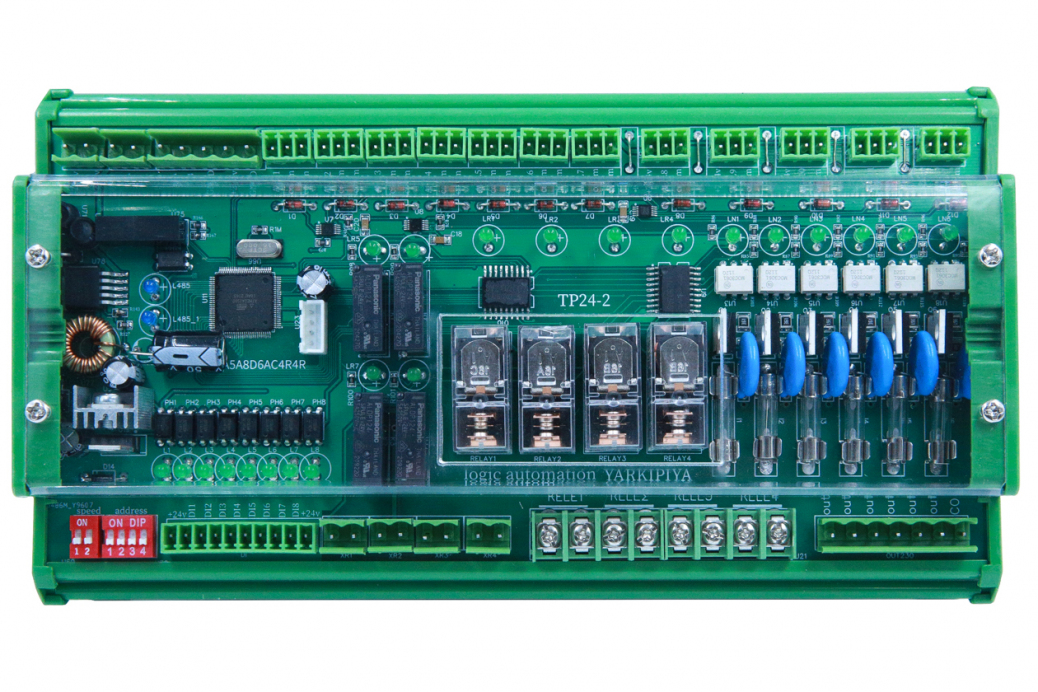 Многофункциональный модуль вывода MB24-8R8AC4U. 8 надежных реле Panasonic 5А 250в, 8 выходных симисторных ключей до 3А 230в с защитой от обратных импульсов индуктивных нагрузок, 4 выхода 0-10в. Изолированный интерфейс RS485, протокол Modbus RTU. Размеры 130/145/55. DINрейка 35. Питание модуля 24DC.